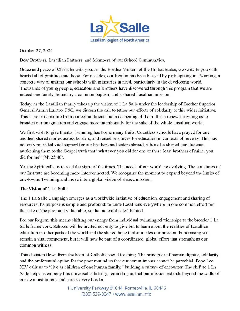“The 1 La Salle Campaign emerges as a worldwide initiative of education, engagement and sharing of resources. Its purpose is simple and profound: to unite Lasallians everywhere in one common effort for the sake of the poor and vulnerable, so that no child is left behind.”