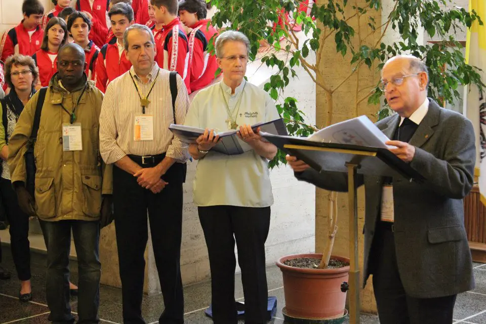 International Mission Assembly: Superior General Brother Álvaro Rodríguez Echeverría, FSC, addresses delegates. Brother Charles Kitson, FSC, listens on the left.