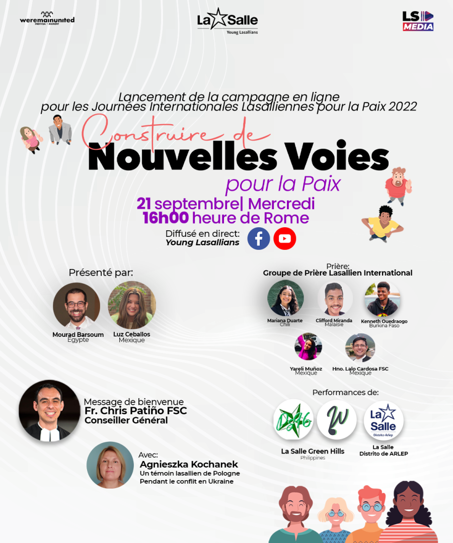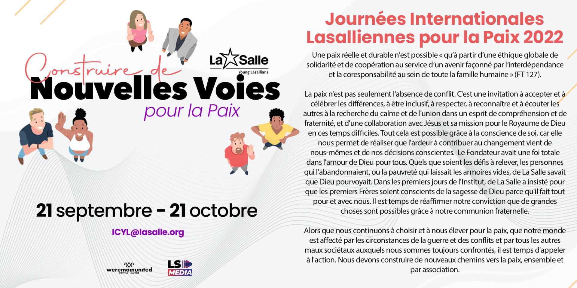 - Watch the online kick off the 2022 International Lasallian Days for Peace Wednesday, September 21 at 10:00 a.m. EDT >