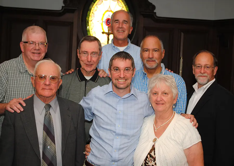 Top row: Bro. Dennis Malloy, FSC, Visitor of DENA; middle row, l to r: Bro. Dennis Lee, FSC, Auxiliary Visitor of DENA, Bro. James Wallace, FSC, Bro. Augustine Nicoletti, FSC, Mr. Alan Weyland, Executive Director for the DENA Office of Mission and Ministry; bottom row: Mr. Richard Ward (center) and his parents John and Marion