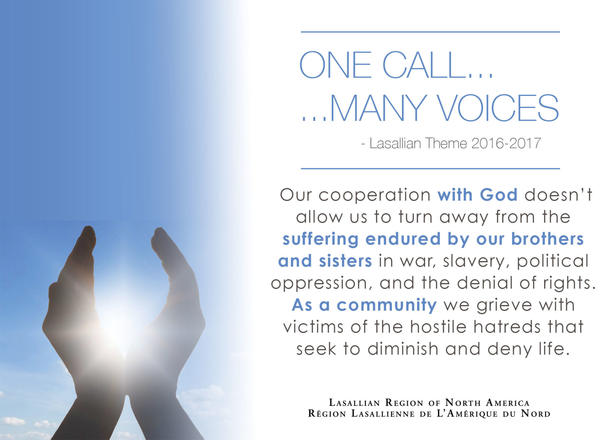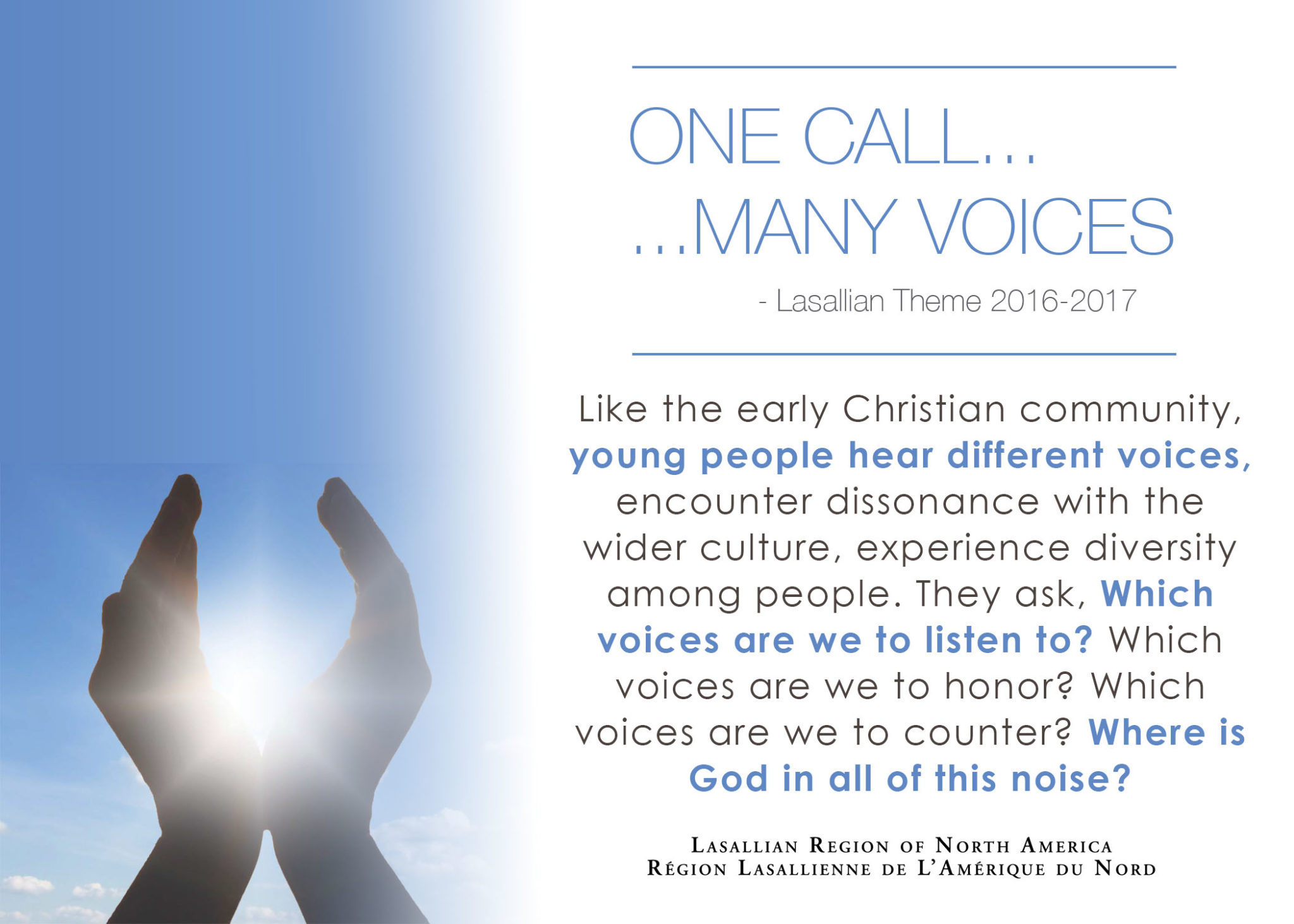 The Lasallian theme for the 2016-2017 liturgical year is “One Call, Many Voices.” The two global trends that we draw attention to in the Lasallian Reflection for this theme are “sustaining spirituality amidst secularization” and a “new way of being Church.”