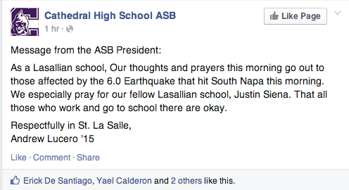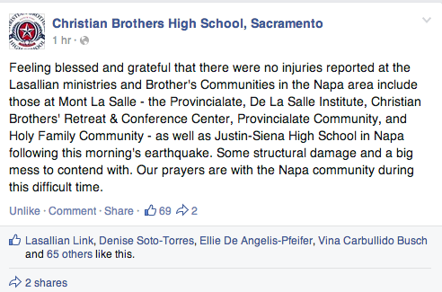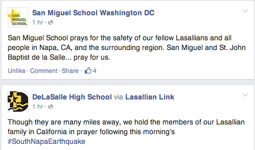 Meanwhile, Lasallians across the Lasallian of Region of North America posted their prayers on social media to fellow Lasallians in Napa. Please keep Lasallians and all of those impacted by the earthquake in your prayers. Visit the SFNO website for more information >