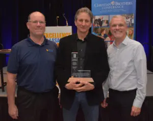 Dr. Peter Imperial, center, principal of Saint Mary’s College High School, accepts the Brother Michael Collins Award of Excellence. Brother James Joost, FSC, left, Auxiliary Visitor of the District of San Francisco New Orleans, and Dr. Mike Daniels, right, director of the Office of Education for the District of San Francisco New Orleans, join him.