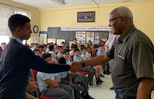 Eric Rodriguez shakes hands with Brother Ghebreyesus Habte, FSC, at The De La Salle School in Freeport, New York. Courtesy Maryann Donohue-Lynch