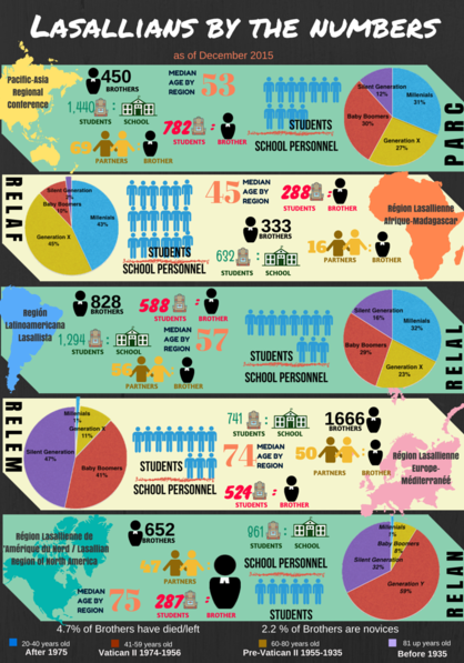 The Institute has released a new booklet that illustrates the Lasallian family throughout the world. The East Asia District office in the Pacific-Asia Regional Conference (PARC) compiled the booklet in December 2015. The booklet breaks down data about Lasallians in each Region and throughout the world.