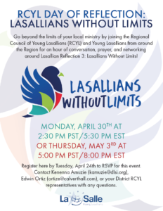 The Regional Council of Young Lasallians (RCYL) will host its inaugural online formation event, “RCYL Day of Reflection: Lasallians Without Limits.” The day of reflection will provide an opportunity for Lasallian educators and professionals from across the Lasallian Region of North America (RELAN) to gather for conversation, reflection and prayer centered around the Institute-wide Lasallian Reflection 3, Lasallians Without Limits.