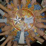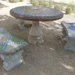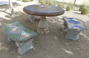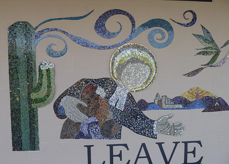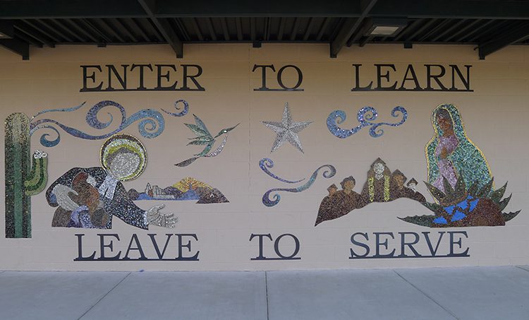 Students also designed and created a mosaic table and three benches based on the prayer of St. Francis of Assisi. The mural and benches were created in partnership with Sonoran Glass School and donations from: Scorpion Wrought Iron, Joseph Valerio, Tucson Stained Glass, Arizona Steel, Courtyard, Target Foundation and the San Miguel High School art department.