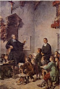 A chance encounter with Adrian Nyel, a layman establishing schools for poor boys, set him on a new life path. Instead of continuing his rise in Church hierarchy, De La Salle found himself gradually becoming more involved with Nyel in opening schools for the poor. When Nyel left Reims to open more schools, De La Salle assumed leadership of the “teachers,” who were rough and barely literate men. In 1680, he invited them into his family home for meals, which is considered the founding of the Institute.